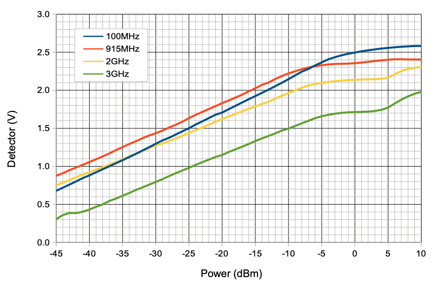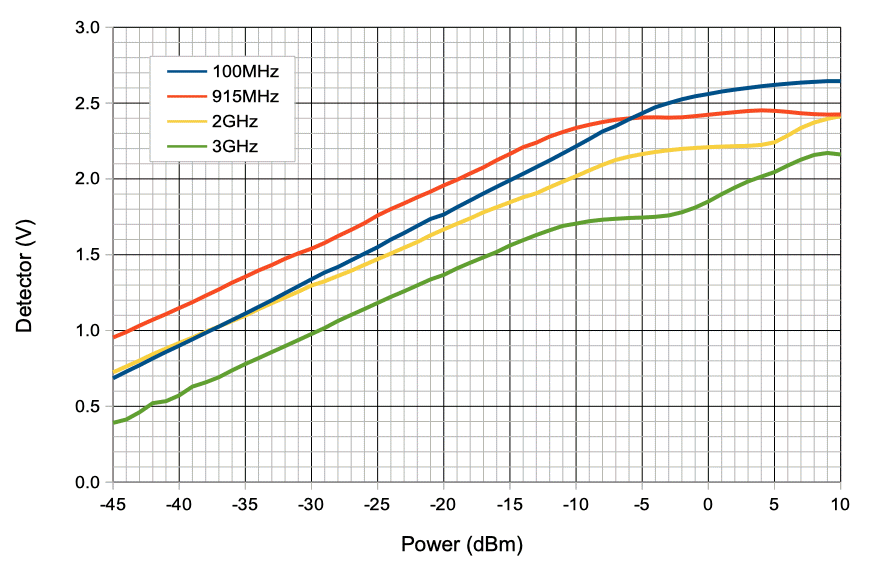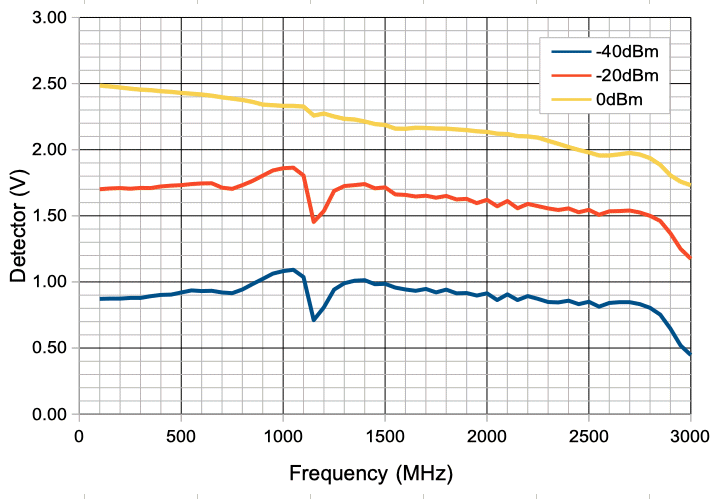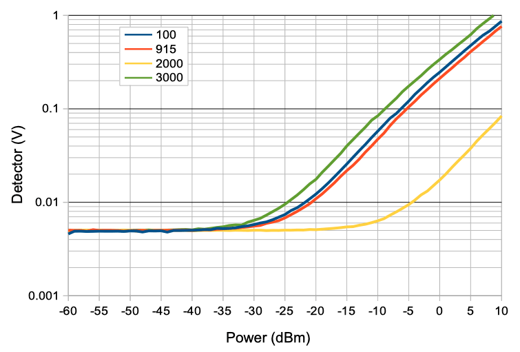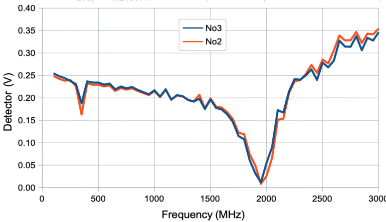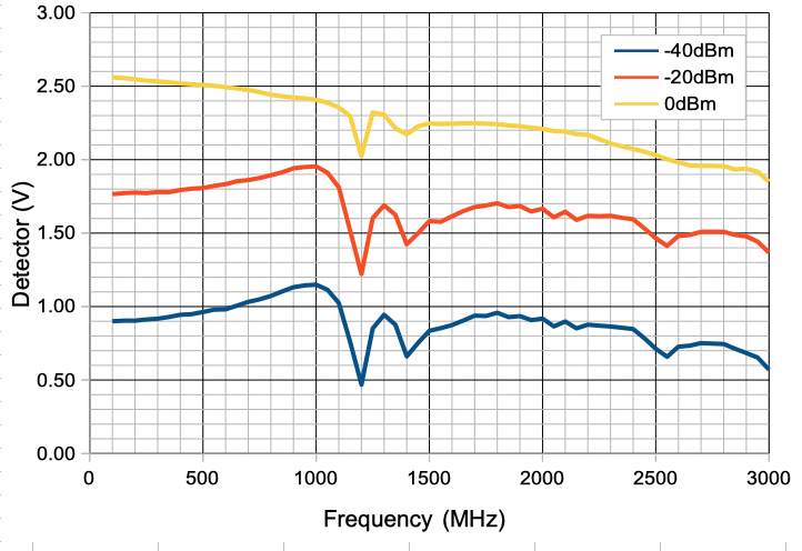 We set the RF power to 0 dBm and increase the frequency from 100 MHz to 3000 MHz. We are delivering the RF power to the X1 input BNC socket through a 1-m RG-58C cable. The power detector works well from 100 MHz to 1.5 GHz, but at higher frequencies our detector diode ground is inadequate. Attenuators on the X1 BNC socket, and varying the length of the cable through which we deliver the RF power did nothing to stop the dead spot at 2 GHz, nor the climb in detector voltage up to 3 GHz.