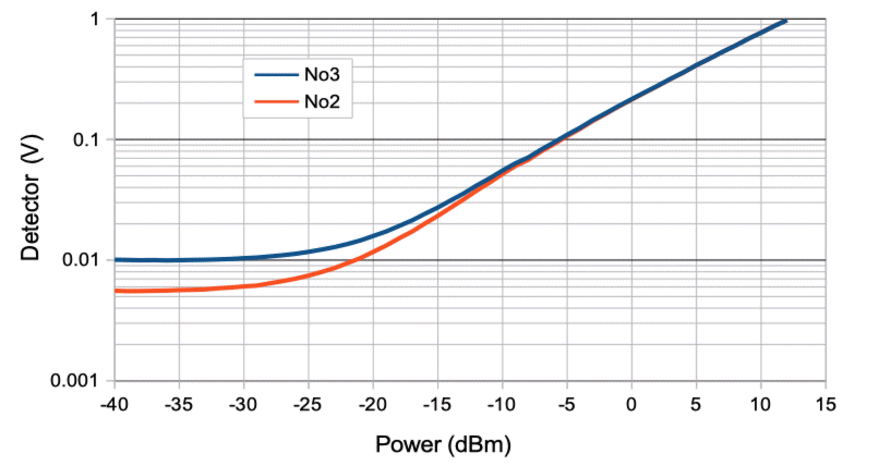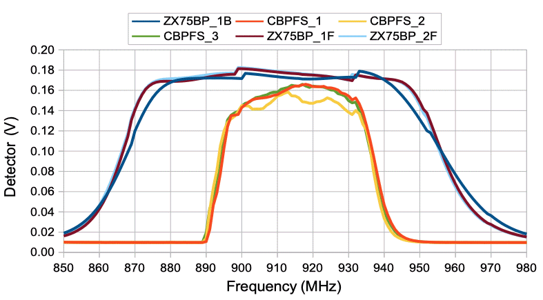 The calibration of this A2057R power detector is 216 mV at 0 dBm, 165 mV at −2 dBm, and 145 mV at −3 dBm. The pass-band insertion loss of all three filters is less than 3 dBm. The CBPFS filters attenuate to 20 mV within 10 MHz of their nominal 902-928 MHz passband. This 20 mV corresponds to −18 dBm.