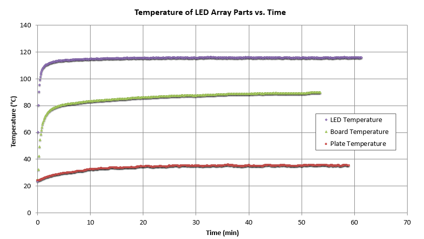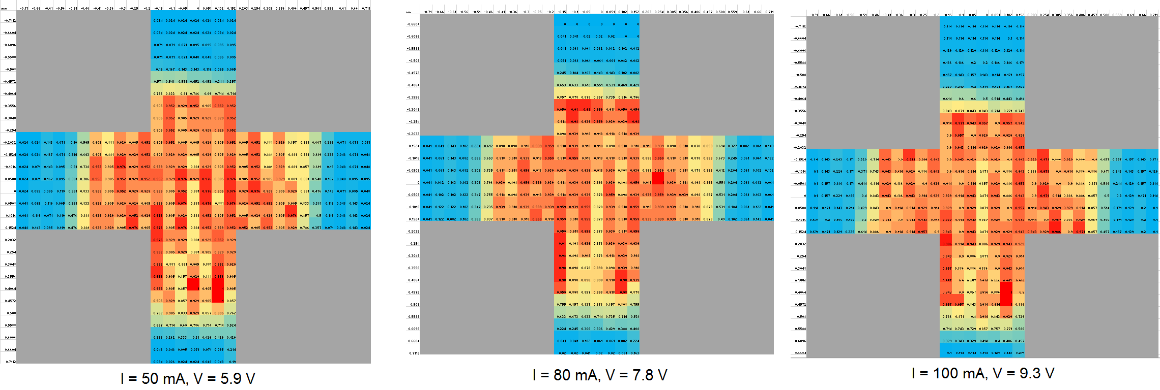 This shows a heat-map style chart to show the bright and dark sections of many seperate LEDs. Some patterns are common, such as dark stretches through their centers, but each LED shows a distinct and unique distribution of power output. The differences in intensity output between the brighter and darker patches in similar structures vary as well. The first image above shows the intensity profile of an LED with a dark stripe directly through the middle, as well as large variations in intensity along the top left corner. The second image shows little variation from one point to the next throughout the center. In the first image, the dark stripe through the middle only emits about 35% of the maximum power output at any point on that LED. Drastic differences between areas such as this above were rare, but must be accounted for.