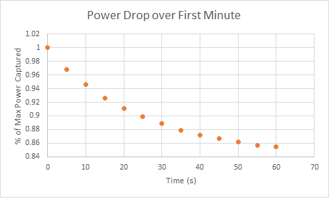 After about 25 seconds, the intensity output drops to 90%. Power output never drops below 75-80% of the maximum because the temperature increase slows down.